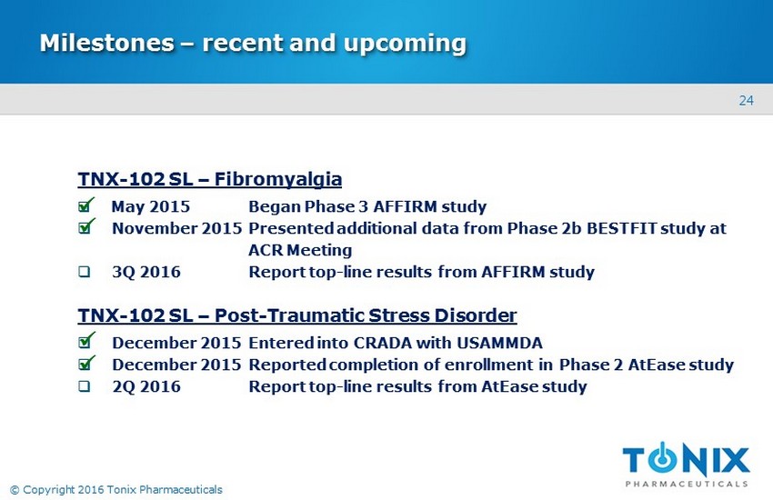 23 © Copyright 2016 Tonix Pharmaceuticals Board of directors Seth Lederman, MD Chairman Ernest Mario, PhD ALZA, Glaxo, Reliant Pharma John Rhodes NYSERDA, NRDC, Booz Allen Hamilton Samuel Saks, MD Jazz Pharma, ALZA, Johnson & Johnson Charles Mather BTIG, Janney, Jefferies, Cowen, Smith Barney Stuart Davidson Labrador Ventures, Alkermes , Combion Patrick Grace Apollo Philanthropy, WR Grace, Chemed Donald Landry, MD, PhD Chair of Medicine, Columbia University