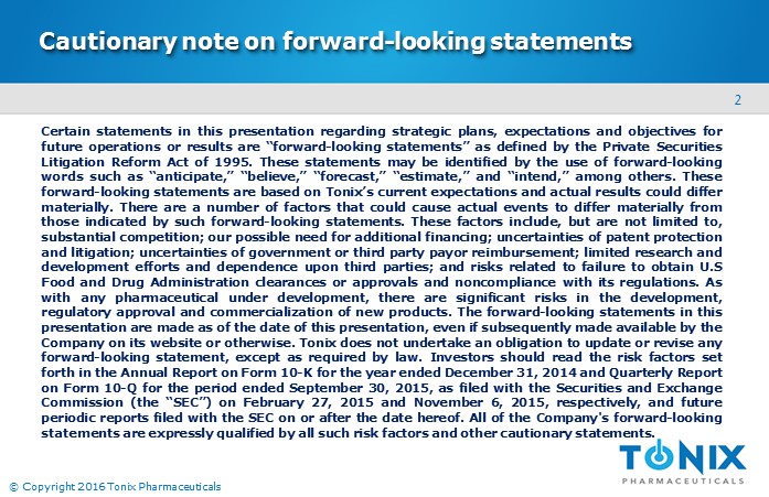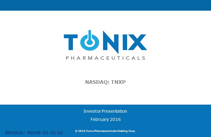 ©S Copyright 2016 Tonix Pharmaceuticals - Confidential - Do not duplicate or distribute NASDAQ: TNXP Investor Presentation February 2016 © 2016 Tonix Pharmaceuticals Holding Corp. Version: P0008 - 02 - 25 - 16
