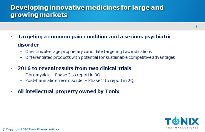 2 © Copyright 2016 Tonix Pharmaceuticals Cautionary note on forward - looking statements Certain statements in this presentation regarding strategic plans, expectations and objectives for future operations or results are “forward - looking statements” as defined by the Private Securities Litigation Reform Act of 1995 . These statements may be identified by the use of forward - looking words such as “anticipate,” “believe,” “forecast,” “ estimate,” and “intend,” among others . These forward - looking statements are based on Tonix’s current expectations and actual results could differ materially . There are a number of factors that could cause actual events to differ materially from those indicated by such forward - looking statements . These factors include, but are not limited to, substantial competition ; our possible need for additional financing ; uncertainties of patent protection and litigation ; uncertainties of government or third party payor reimbursement ; limited research and development efforts and dependence upon third parties ; and risks related to failure to obtain U . S Food and Drug Administration clearances or approvals and noncompliance with its regulations . As with any pharmaceutical under development, there are significant risks in the development, regulatory approval and commercialization of new products . The forward - looking statements in this presentation are made as of the date of this presentation, even if subsequently made available by the Company on its website or otherwise . Tonix does not undertake an obligation to update or revise any forward - looking statement, except as required by law . Investors should read the risk factors set forth in the Annual Report on Form 10 - K for the year ended December 31 , 2014 and Quarterly Report on Form 10 - Q for the period ended September 30 , 2015 , as filed with the Securities and Exchange Commission (the “SEC”) on February 27 , 2015 and November 6 , 2015 , respectively, and future periodic reports filed with the SEC on or after the date hereof . All of the Company's forward - looking statements are expressly qualified by all such risk factors and other cautionary statements .