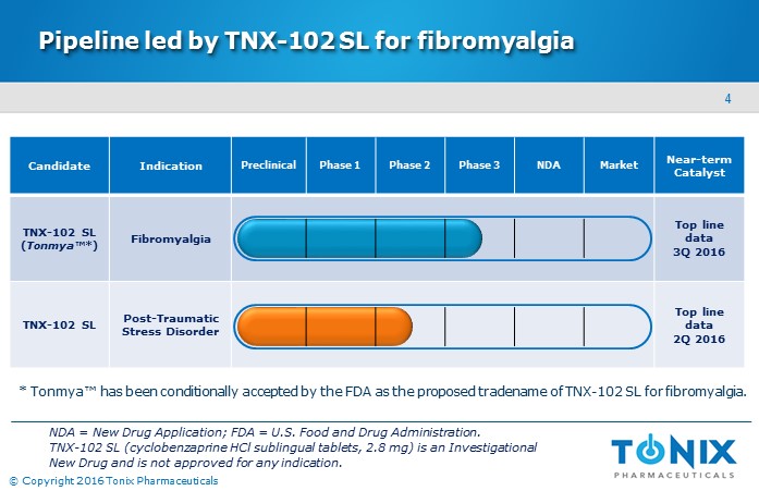 3 © Copyright 2016 Tonix Pharmaceuticals Developing innovative medicines for large and growing markets • Targeting a common pain condition and a serious psychiatric disorder ‒ One clinical - stage proprietary candidate targeting two indications ‒ Differentiated products with potential for sustainable competitive advantages • 2016 to reveal results from two clinical trials ‒ Fibromyalgia – Phase 3 to report in 3Q ‒ Post - traumatic stress disorder – Phase 2 to report in 2Q • All intellectual property owned by Tonix