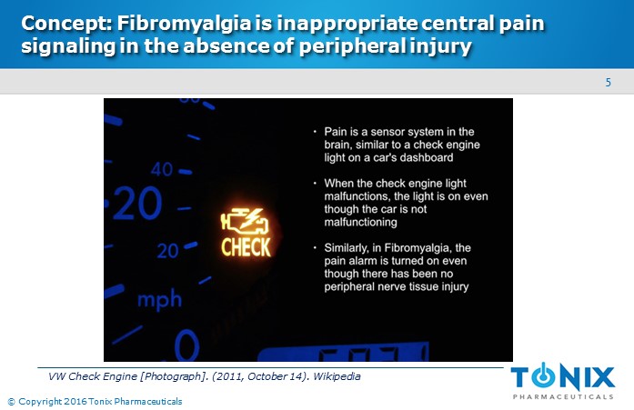 5 © Copyright 2016 Tonix Pharmaceuticals Concept: Fibromyalgia is inappropriate central pain signaling in the absence of peripheral injury VW Check Engine [Photograph]. (2011, October 14). Wikipedia