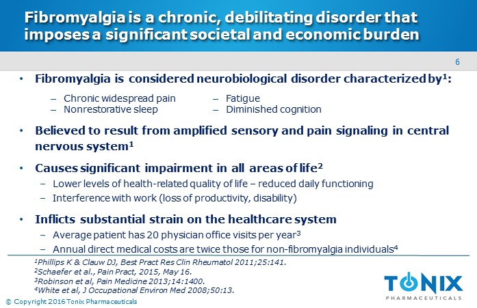 4 © Copyright 2016 Tonix Pharmaceuticals Candidate Indication Near - term Catalyst TNX - 102 SL ( Tonmya ™ *) Fibromyalgia Top line data 3Q 2016 TNX - 102 SL Post - Traumatic Stress Disorder Top line data 2Q 2016 Pipeline led by TNX - 102 SL for fibromyalgia Preclinical Phase 1 Phase 2 Phase 3 NDA Market NDA = New Drug Application; FDA = U.S. Food and Drug Administration. T NX - 102 SL (cyclobenzaprine HCl sublingual tablets, 2.8 mg) is an Investigational New Drug and is not approved for any indication. * Tonmya ™ has been conditionally accepted by the FDA as the proposed tradename of TNX - 102 SL for fibromyalgia.