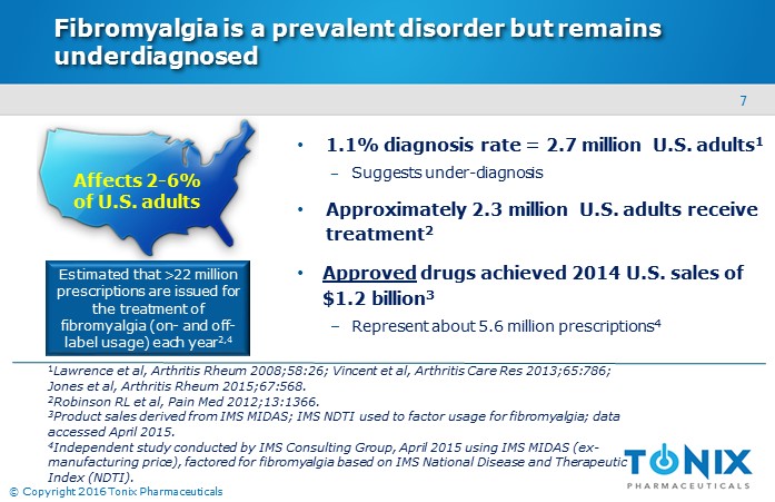 6 © Copyright 2016 Tonix Pharmaceuticals Fibromyalgia is a chronic, debilitating disorder that imposes a significant societal and economic burden • Fibromyalgia is considered neurobiological disorder characterized by 1 : • Believed to result from amplified sensory and pain signaling in central nervous system 1 • Causes significant impairment in all areas of life 2 ‒ Lower levels of health - related quality of life – reduced daily functioning ‒ Interference with work (loss of productivity, disability ) • Inflicts substantial strain on the healthcare system ‒ Average patient has 20 physician office visits per year 3 ‒ Annual direct medical costs are twice those for non - fibromyalgia individuals 4 1 Phillips K & Clauw DJ, Best Pract Res Clin Rheumatol 2011;25:141. 2 Schaefer et al., Pain Pract , 2015, May 16. 3 Robinson et al, Pain Medicine 2013;14:1400. 4 White et al, J Occupational Environ Med 2008;50:13. – C hronic widespread pain – Nonrestorative sleep – Fatigue – D iminished cognition