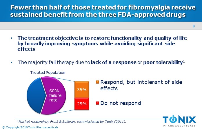7 © Copyright 2016 Tonix Pharmaceuticals Fibromyalgia is a prevalent disorder but remains underdiagnosed 1 Lawrence et al, Arthritis Rheum 2008;58:26; Vincent et al, Arthritis Care Res 2013;65:786; Jones et al, Arthritis Rheum 2015;67:568. 2 Robinson RL et al, Pain Med 2012;13:1366. 3 Product sales derived from IMS MIDAS; IMS NDTI used to factor usage for fibromyalgia; data accessed April 2015. 4 Independent study conducted by IMS Consulting Group, April 2015 using IMS MIDAS (ex - manufacturing price), factored for fibromyalgia based on IMS National Disease and Therapeutic Index (NDTI). Affects 2 - 6% of U.S. adults • 1.1% diagnosis rate = 2.7 million U.S. adults 1 ‒ S uggests under - diagnosis • Approximately 2.3 million U.S. adults receive treatment 2 • Approved drugs achieved 2014 U.S. sales of $1.2 billion 3 ‒ Represent about 5.6 million prescriptions 4 Estimated that >22 million prescriptions are issued for the treatment of fibromyalgia (on - and off - label usage) each year 2,4