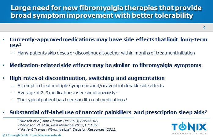 8 © Copyright 2016 Tonix Pharmaceuticals Fewer than half of those treated for fibromyalgia receive sustained benefit from the three FDA - approved drugs • The treatment objective is to restore functionality and quality of life by broadly improving symptoms while avoiding significant side effects • The majority fail therapy due to lack of a response or poor tolerability 1 Respond, but intolerant of side effects Do not respond 25% 35% 60% failure rate 1 Market research by Frost & Sullivan, commissioned by Tonix (2011). T reated P opulation