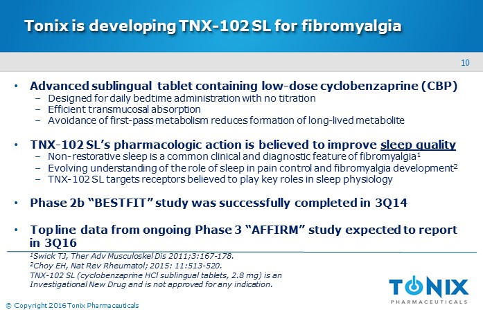 9 © Copyright 2016 Tonix Pharmaceuticals Large need for new fibromyalgia therapies that provide broad symptom improvement with better tolerability • Currently - approved medications may have side effects that limit long - term use 1 ‒ Many patients skip doses or discontinue altogether within months of treatment initiation • Medication - related side effects may be similar to fibromyalgia symptoms • High rates of discontinuation, switching and augmentation ‒ A ttempt to treat multiple symptoms and/or avoid intolerable side effects ‒ Average of 2 - 3 medications used simultaneously 2 ‒ The typical patient has tried six different medications 3 • Substantial off - label use of narcotic painkillers and prescription sleep aids 3 1 Nuesch et al, Ann Rheum Dis 2013;72:955 - 62. 2 Robinson RL et al, Pain Medicine 2012;13:1366. 3 “Patient Trends: Fibromyalgia”, Decision Resources, 2011.