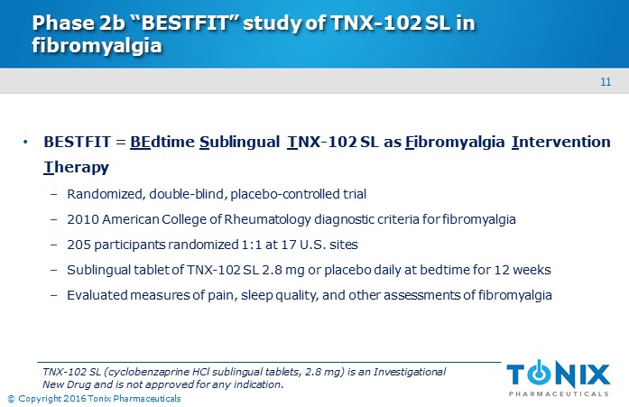 10 © Copyright 2016 Tonix Pharmaceuticals Tonix is developing TNX - 102 SL for fibromyalgia • Advanced sublingual tablet containing low - dose cyclobenzaprine (CBP ) ‒ Designed for daily bedtime administration with no titration ‒ Efficient transmucosal absorption ‒ Avoidance of first - pass metabolism reduces formation of long - lived metabolite • TNX - 102 SL’s pharmacologic action is believed to improve sleep quality ‒ Non - restorative sleep is a common clinical and diagnostic feature of fibromyalgia 1 ‒ Evolving understanding of the role of sleep in pain control and fibromyalgia development 2 ‒ TNX - 102 SL targets receptors believed to play key roles in sleep physiology • Phase 2b “BESTFIT” study was successfully completed in 3Q14 • Top line data from ongoing Phase 3 “AFFIRM” study expected to report in 3Q16 1 Swick TJ, Ther Adv Musculoskel Dis 2011;3:167 - 178 . 2 Choy EH, Nat Rev Rheumatol ; 2015: 11:513 - 520. TNX - 102 SL (cyclobenzaprine HCl sublingual tablets, 2.8 mg) is an Investigational New Drug and is not approved for any indication .