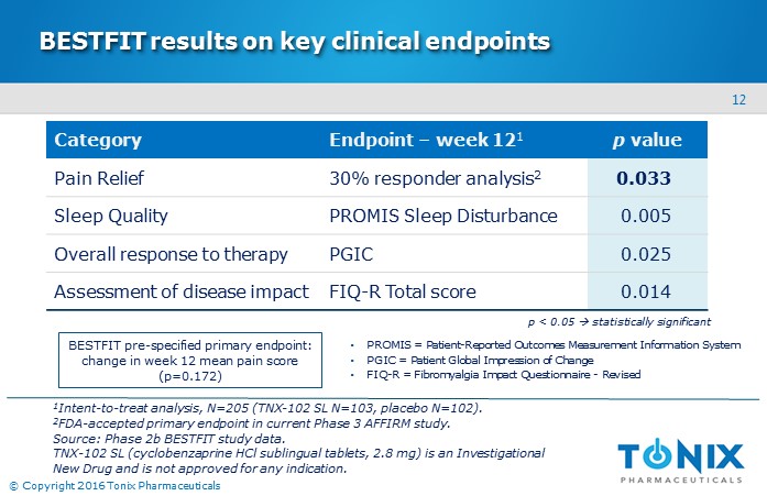 11 © Copyright 2016 Tonix Pharmaceuticals Phase 2b “BESTFIT” study of TNX - 102 SL in fibromyalgia • BESTFIT = BE dtime S ublingual T NX - 102 SL as F ibromyalgia I ntervention T herapy ‒ Randomized , double - blind, placebo - controlled trial ‒ 2010 American College of Rheumatology diagnostic criteria for fibromyalgia ‒ 205 participants randomized 1:1 at 17 U.S. sites ‒ S ublingual tablet of TNX - 102 SL 2.8 mg or placebo daily at bedtime for 12 weeks ‒ Evaluated measures of pain, sleep quality, and other assessments of fibromyalgia TNX - 102 SL (cyclobenzaprine HCl sublingual tablets, 2.8 mg) is an Investigational New Drug and is not approved for any indication.