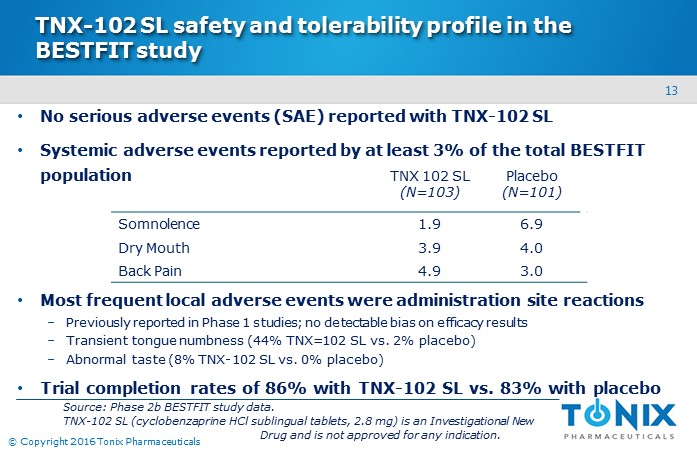 12 © Copyright 2016 Tonix Pharmaceuticals BESTFIT results on key clinical endpoints Category Endpoint – week 12 1 p value Pain Relief 30% responder analysis 2 0.033 Sleep Quality PROMIS Sleep Disturbance 0.005 Overal l response to therapy PGIC 0.025 Assessment of disease impact FIQ - R Total score 0.014 1 Intent - to - treat analysis, N=205 (TNX - 102 SL N=103, placebo N=102 ). 2 FDA - accepted primary endpoint in current Phase 3 AFFIRM study. Source : Phase 2b BESTFIT study data. TNX - 102 SL (cyclobenzaprine HCl sublingual tablets, 2.8 mg) is an Investigational New Drug and is not approved for any indication. BESTFIT pre - specified primary endpoint: change in week 12 mean pain score (p=0.172) • PROMIS = Patient - Reported Outcomes Measurement Information System • PGIC = Patient Global Impression of Change • FIQ - R = Fibromyalgia Impact Questionnaire - Revised p < 0.05 s tatistically significant