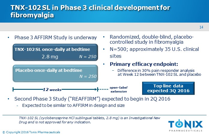 13 © Copyright 2016 Tonix Pharmaceuticals TNX - 102 SL safety and tolerability profile in the BESTFIT study • No serious adverse events (SAE) reported with TNX - 102 SL • Systemic adverse events reported by at least 3% of the total BESTFIT population • Most frequent local adverse events were administration site reactions ‒ Previously reported in Phase 1 studies; no detectable bias on efficacy results ‒ Transient tongue numbness ( 44% TNX=102 SL vs . 2% placebo) ‒ Abnormal taste (8% TNX - 102 SL vs . 0% placebo ) • Trial completion rates of 86% with TNX - 102 SL vs. 83% with placebo TNX 102 SL (N=103) Placebo (N=101) Somnolence 1.9 6.9 Dry Mouth 3.9 4.0 Back Pain 4.9 3.0 Source: Phase 2b BESTFIT study data. TNX - 102 SL (cyclobenzaprine HCl sublingual tablets, 2.8 mg) is an Investigational New Drug and is not approved for any indication.