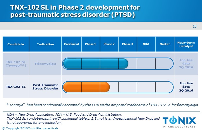 14 © Copyright 2016 Tonix Pharmaceuticals • Phase 3 AFFIRM Study is underway • Second Phase 3 Study (“REAFFIRM”) expected to begin in 2Q 2016 - E xpected to be similar to AFFIRM in design and size TNX - 102 SL in Phase 3 clinical development for fibromyalgia • Randomized, double - blind, placebo - controlled study in fibromyalgia • N=500; approximately 35 U.S. clinical sites • Primary efficacy endpoint: ‒ Difference in 30% pain responder analysis at Week 12 between TNX - 102 SL and placebo Placebo once - daily at bedtime 12 weeks TNX - 102 SL once - daily at bedtime N = 250 N = 250 2.8 mg open - label extension TNX - 102 SL (cyclobenzaprine HCl sublingual tablets, 2.8 mg) is an Investigational New Drug and is not approved for any indication. Top line data expected 3 Q 2016
