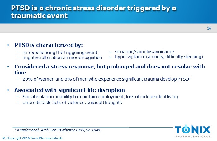 15 © Copyright 2016 Tonix Pharmaceuticals TNX - 102 SL in Phase 2 development for post - traumatic stress disorder (PTSD) Phase 1 Phase 2 Phase 3 NDA * Tonmya ™ has been conditionally accepted by the FDA as the proposed tradename of TNX - 102 SL for fibromyalgia. NDA = New Drug Application; FDA = U.S. Food and Drug Administration. T NX - 102 SL (cyclobenzaprine HCl sublingual tablets, 2.8 mg) is an Investigational New Drug and is not approved for any indication. Candidate Indication Near - term Catalyst TNX - 102 SL ( Tonmya ™ *) Fibromyalgia Top line data 3Q 2016 TNX - 102 SL Post - Traumatic Stress Disorder Top line data 2Q 2016 Preclinical Phase 1 Phase 2 Phase 3 NDA Market