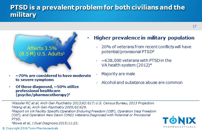 16 © Copyright 2016 Tonix Pharmaceuticals PTSD is a chronic stress disorder triggered by a traumatic event • PTSD is characterized by: • Considered a stress response, but prolonged and does not resolve with time ‒ 20% of women and 8 % of men who experience significant trauma develop PTSD 1 • Associated with significant life disruption ‒ Social isolation, inability to maintain employment, loss of independent living ‒ Unpredictable acts of violence, suicidal thoughts – re - experiencing the triggering event – negative alterations in mood/cognition – situation/stimulus avoidance – hypervigilance (anxiety, difficulty sleeping) 1 Kessler et al, Arch Gen Psychiatry 1995;52:1048.