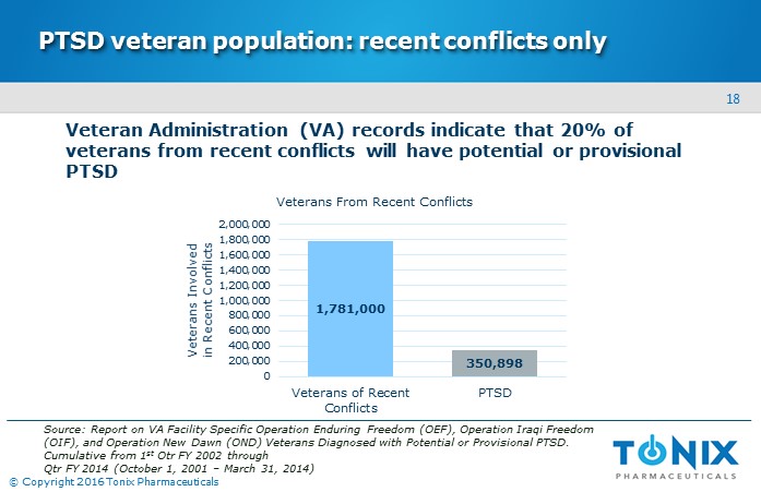 17 © Copyright 2016 Tonix Pharmaceuticals PTSD is a prevalent problem for both civilians and the military • ~70% are considered to have moderate to severe symptoms • Of those diagnosed, ~50% utilize professional healthcare (psycho/pharmacotherapy) 2 1 Kessler RC at al, Arch Gen Psychiatry 2013;62:617; U.S. Census Bureau, 2013 Projection. 2 Wang et al, Arch Gen Psychiatry 2005;62:629. 3 Report on VA Facility Specific Operation Enduring Freedom (OEF), Operation Iraqi Freedom (OIF), and Operation New Dawn (OND) Veterans Diagnosed with Potential or Provisional PTSD. 4 Bowe et al, J Dual Diagnosis 2015;11:22. Affects 3.5% (8.5 M) U.S. Adults 1 • Higher prevalence in military population - 20% of veterans from recent conflicts will have potential/provisional PTSD 3 - ~638,000 veterans with PTSD in the VA health system ( 2012) 4 - Majority are male - Alcohol and substance abuse are common
