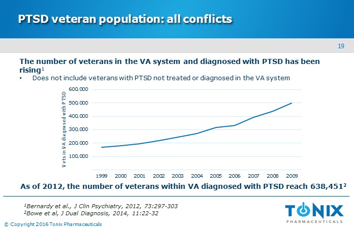 18 © Copyright 2016 Tonix Pharmaceuticals PTSD veteran population: recent conflicts only Veteran Administration (VA) records indicate that 20% of veterans from recent conflicts will have potential or provisional PTSD Source: Report on VA Facility Specific Operation Enduring Freedom (OEF), Operation Iraqi Freedom (OIF), and Operation New Dawn (OND) Veterans Diagnosed with Potential or Provisional PTSD. Cumulative from 1 st Otr FY 2002 through Qtr FY 2014 (October 1, 2001 – March 31, 2014) 1,781,000 350,898 0 200,000 400,000 600,000 800,000 1,000,000 1,200,000 1,400,000 1,600,000 1,800,000 2,000,000 Veterans of Recent Conflicts PTSD Veterans Involved in Recent Conflicts Veterans From Recent Conflicts