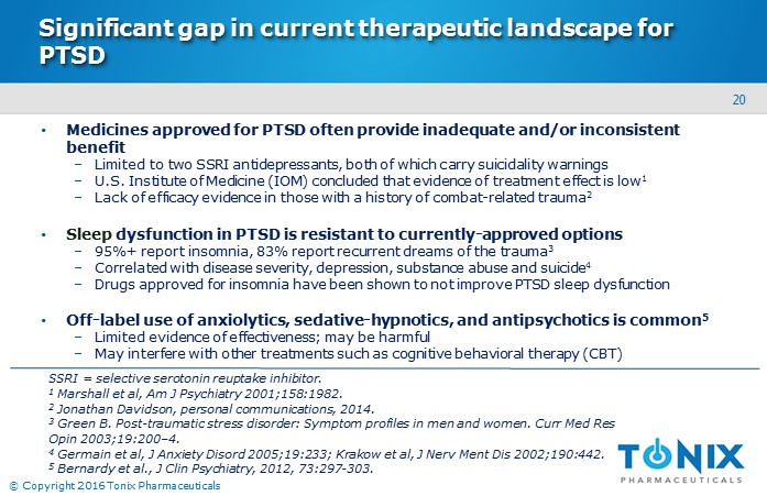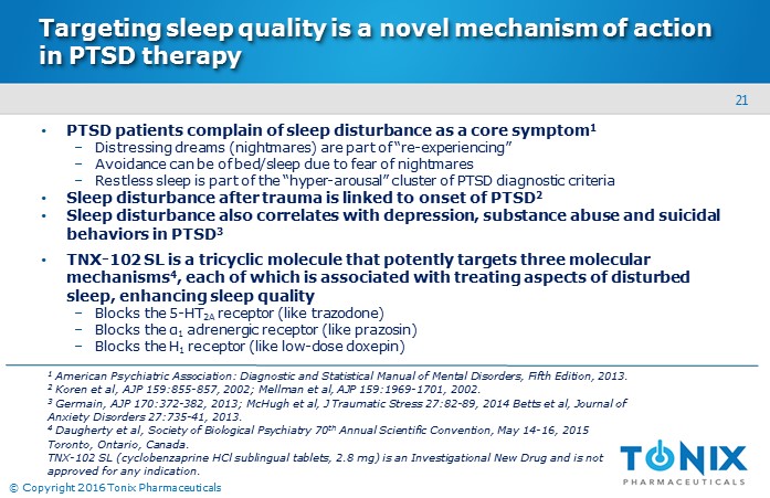 20 © Copyright 2016 Tonix Pharmaceuticals Significant gap in current therapeutic landscape for PTSD • M edicines approved for PTSD often provide inadequate and/or inconsistent benefit ‒ Limited to two SSRI antidepressants, both of which carry suicidality warnings ‒ U.S. Institute of Medicine (IOM) concluded that evidence of treatment effect is low 1 ‒ Lack of efficacy evidence in those with a history of combat - related trauma 2 • Sleep dysfunction in PTSD is resistant to currently - approved options ‒ 95 %+ report insomnia, 83% report recurrent dreams of the trauma 3 ‒ Correlated with disease severity, depression, substance abuse and suicide 4 ‒ Drugs approved for insomnia have been shown to not improve PTSD sleep dysfunction • Off - label use of anxiolytics, sedative - hypnotics, and antipsychotics is common 5 ‒ L imited evidence of effectiveness; may be harmful ‒ M ay interfere with other treatments such as cognitive behavioral therapy (CBT) SSRI = selective serotonin reuptake inhibitor. 1 Marshall et al, Am J Psychiatry 2001;158:1982. 2 Jonathan Davidson, personal communications, 2014. 3 Green B. Post - traumatic stress disorder: Symptom profiles in men and women. Curr Med Res Opin 2003;19:200 – 4 . 4 Germain et al, J Anxiety Disord 2005;19:233; Krakow et al, J Nerv Ment Dis 2002;190:442. 5 Bernardy et al., J Clin Psychiatry, 2012, 73:297 - 303.