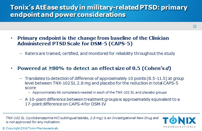 21 © Copyright 2016 Tonix Pharmaceuticals Targeting sleep quality is a novel mechanism of action in PTSD therapy • PTSD patients complain of sleep disturbance as a core symptom 1 ‒ Distressing dreams (nightmares) are part of “re - experiencing” ‒ Avoidance can be of bed/sleep due to fear of nightmares ‒ Restless sleep is part of the “hyper - arousal” cluster of PTSD diagnostic criteria • Sleep disturbance after trauma is linked to onset of PTSD 2 • Sleep disturbance also correlates with depression, substance abuse and suicidal behaviors in PTSD 3 • TNX - 102 SL is a tricyclic molecule that potently targets three molecular mechanisms 4 , each of which is associated with treating aspects of disturbed sleep, enhancing sleep quality ‒ Blocks the 5 - HT 2A receptor (like trazodone ) ‒ Blocks the α 1 adrenergic receptor (like prazosin ) ‒ Blocks the H 1 receptor (like low - dose doxepin) 1 American Psychiatric Association: Diagnostic and Statistical Manual of Mental Disorders, Fifth Edition, 2013. 2 Koren et al, AJP 159:855 - 857, 2002; Mellman et al, AJP 159:1969 - 1701, 2002. 3 Germain , AJP 170:372 - 382, 2013; McHugh et al, J Traumatic Stress 27:82 - 89, 2014 Betts et al, Journal of Anxiety Disorders 27:735 - 41, 2013. 4 Daugherty et al, Society of Biological Psychiatry 70 th Annual Scientific Convention, May 14 - 16, 2015 Toronto, Ontario, Canada. T NX - 102 SL (cyclobenzaprine HCl sublingual tablets, 2.8 mg) is an Investigational New Drug and is not approved for any indication.