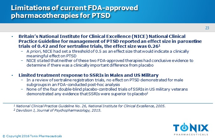 22 © Copyright 2016 Tonix Pharmaceuticals Tonix’s AtEase study in military - related PTSD: primary endpoint and power considerations • Primary endpoint is the change from baseline of the Clinician Administered PTSD Scale for DSM - 5 (CAPS - 5) ‒ Raters are trained, certified, and monitored for reliability throughout the study • Powered at ≥80% to detect an effect size of 0.5 (Cohen’s d ) ‒ Translates to detection of difference of approximately 10 points (8.5 - 11.5) at group level between TNX - 102 SL 2.8 mg and placebo for the reduction in total CAPS - 5 score ‒ Approximately 66 completers needed in each of the TNX - 102 SL and placebo groups ‒ A 10 - point differen c e between treatment groups is approximately equivalent to a 17 - point difference on CAPS - 4 for DSM - IV T NX - 102 SL (cyclobenzaprine HCl sublingual tablets, 2.8 mg) is an Investigational New Drug and is not approved for any indication.