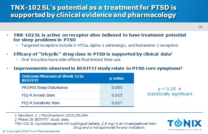 23 © Copyright 2016 Tonix Pharmaceuticals Limitations of current FDA - approved pharmacotherapies for PTSD • Britain’s National Institute for Clinical Excellence (NICE) National Clinical Practice Guideline for management of PTSD reported an effect size in paroxetine trials of 0.42 and for sertraline trials, the effect size was 0.26 1 ‒ A priori, NICE had set a threshold of 0.5 as an effect size that would indicate a clinically meaningful effect on PTSD ‒ NICE stated that neither of these two FDA - approved therapies had conclusive evidence to determine if there was a clinically important difference from placebo • Limited treatment response to SSRIs in Males and US Military ‒ In a review of sertraline registration trials, no effect on PTSD demonstrated for male subgroups in an FDA - conducted post - hoc analysis ‒ None of the four double - b lind placebo - controlled trials of SSRIs in US military veterans demonstrated any evidence that SSRIs were superior to placebo 2 1 National Clinical Practice Guideline No. 26, National Institute for Clinical Excellence, 2005. 2 Davidson J, Journal of Psychopharmacology, 2015.