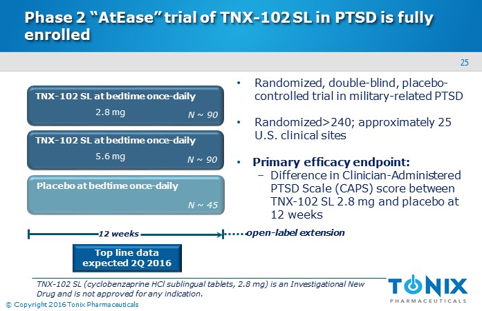 24 © Copyright 2016 Tonix Pharmaceuticals TNX - 102 SL’s potential as a treatment for PTSD is supported by clinical evidence and pharmacology • TNX - 102 SL is active on receptor sites believed to have treatment potential for sleep problems in PTSD ‒ Targeted receptors include 5 - HT2a, alpha - 1 adrenergic, and histamine - 1 receptors • Efficacy of “tricyclic” drug class in PTSD is supported by clinical data 1 ‒ Oral tricyclics have side effects that limited their use • Improvements observed in BESTFIT study relate to PTSD core symptoms 2 Outcome Measure at Week 12 in BESTFIT p value PROMIS Sleep Disturbance 0.005 FIQ - R Anxiety Item 0.015 FIQ - R Sensitivity Item 0.017 1 Davidson J, J Psychopharm 2015;29;264. 2 Phase 2b BESTFIT study data. TNX - 102 SL (cyclobenzaprine HCl sublingual tablets, 2.8 mg) is an Investigational New Drug and is not approved for any indication . p < 0.05 statistically significant