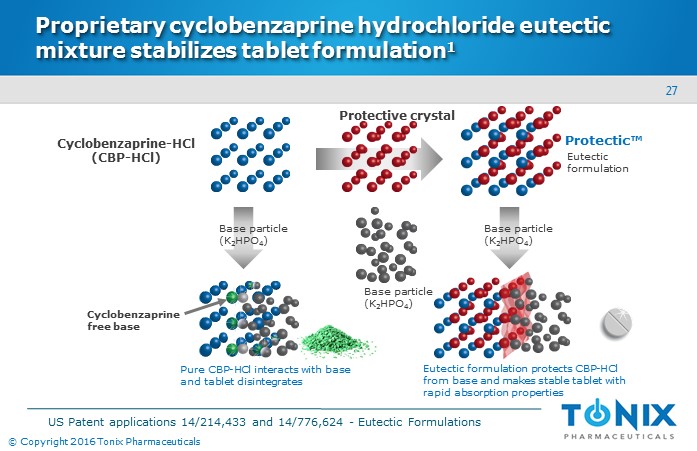27 © Copyright 2016 Tonix Pharmaceuticals Proprietary cyclobenzaprine hydrochloride eutectic mixture stabilizes tablet formulation 1 Base particle (K 2 HPO 4 ) Base particle (K 2 HPO 4 ) Base particle (K 2 HPO 4 ) Eutectic formulation Protective crystal Cyclobenzaprine - HCl (CBP - HCl) Eutectic formulation protects CBP - HCl from base and makes stable tablet with rapid absorption properties Pure CBP - HCl interacts with base and tablet disintegrates Cyclobenzaprine free base Protectic™ US Patent applications 14/214,433 and 14/776,624 - Eutectic Formulations