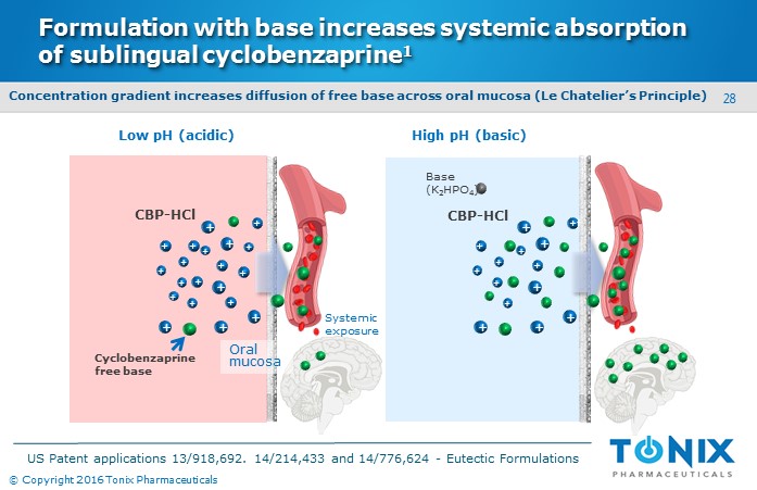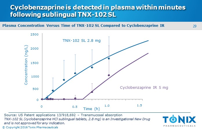 28 © Copyright 2016 Tonix Pharmaceuticals Formulation with base increases systemic absorption of sublingual cyclobenzaprine 1 Concentration gradient increases diffusion of free base across oral mucosa (Le Chatelier’s Principle) CBP - HCl Cyclobenzaprine free base Oral mucosa CBP - HCl Low pH (acidic) High pH (basic) Systemic exposure Base (K 2 HPO 4 ) + + + + + + + + + + + + + + + + + + + + + + + + + + +f + + + + + + + US Patent applications 13/918,692. 14/214,433 and 14/776,624 - Eutectic Formulations