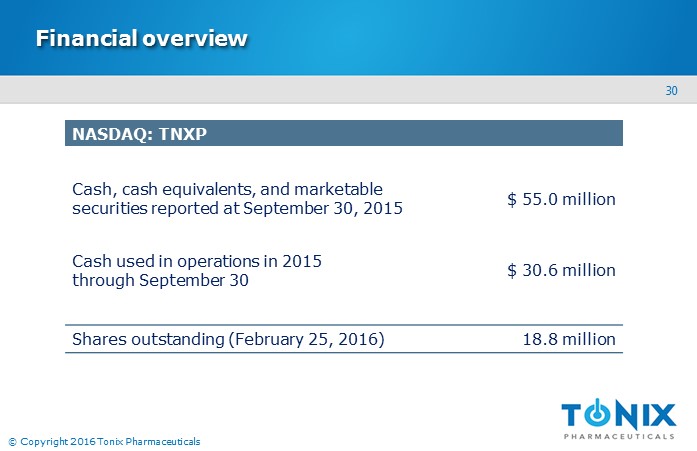 30 © Copyright 2016 Tonix Pharmaceuticals Financial overview NASDAQ: TNXP Cash, cash equivalents, and marketable securities reported at September 30, 2015 $ 55.0 million Cash used in operations in 2015 through September 30 $ 30.6 million Shares outstanding (February 25, 2016) 18.8 million