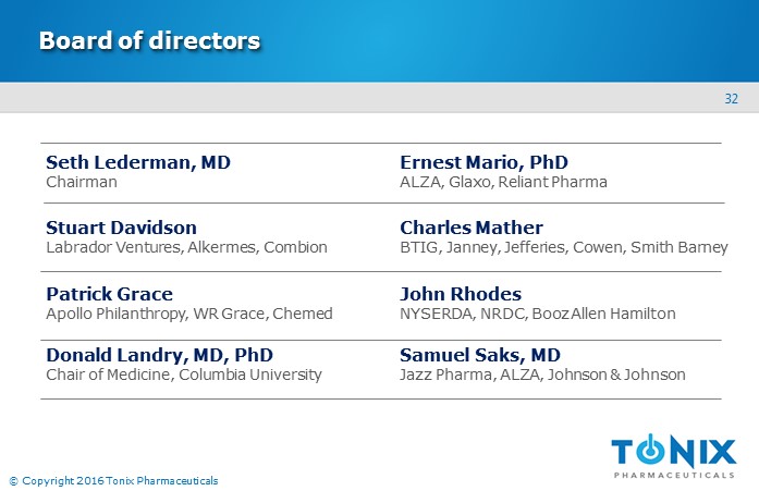 31 © Copyright 2016 Tonix Pharmaceuticals Management team Seth Lederman, MD President & CEO Jessica Edgar Morris EVP, Administration Bruce Daugherty, PhD, MBA Chief Scientific Officer Ronald Notvest, PhD E VP, Commercial Planning & Development Gregory Sullivan, MD Chief Medical Officer Bradley Saenger, CPA Chief Financial Officer