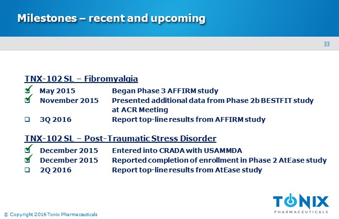 32 © Copyright 2016 Tonix Pharmaceuticals Board of directors Seth Lederman, MD Chairman Ernest Mario, PhD ALZA, Glaxo, Reliant Pharma John Rhodes NYSERDA, NRDC, Booz Allen Hamilton Samuel Saks, MD Jazz Pharma, ALZA, Johnson & Johnson Charles Mather BTIG, Janney, Jefferies, Cowen, Smith Barney Stuart Davidson Labrador Ventures, Alkermes , Combion Patrick Grace Apollo Philanthropy, WR Grace, Chemed Donald Landry, MD, PhD Chair of Medicine, Columbia University