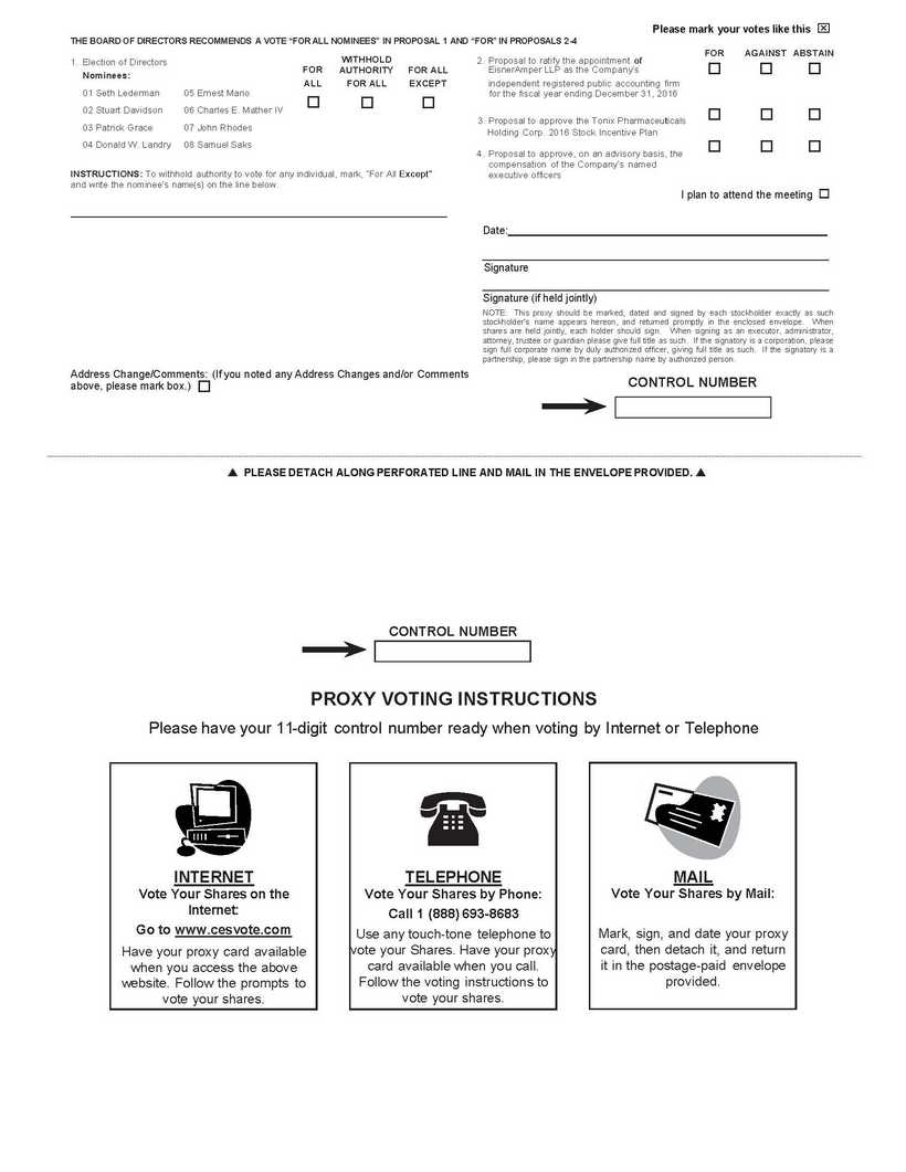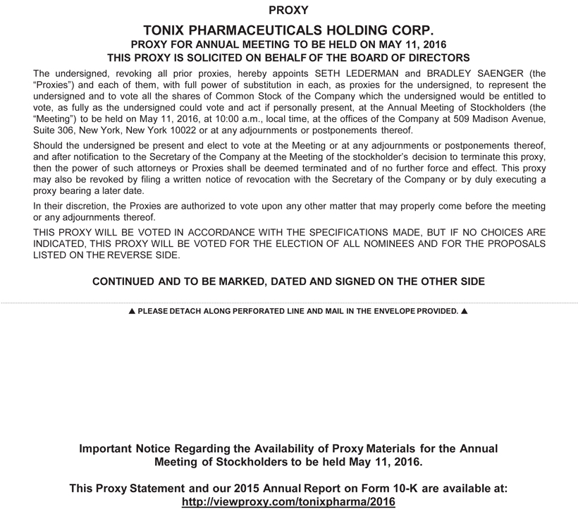 The Proxy Statement and Annual Report on Form 10-K for the year ended December 31, 2015 are available at: http://viewproxy.com/tonixpharma/2016/.