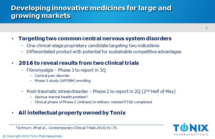 2 © Copyright 2016 Tonix Pharmaceuticals Cautionary note on forward - looking statements Certain statements in this presentation regarding strategic plans, expectations and objectives for future operations or results are “forward - looking statements” as defined by the Private Securities Litigation Reform Act of 1995 . These statements may be identified by the use of forward - looking words such as “anticipate,” “believe,” “forecast,” “ estimate,” and “intend,” among others . These forward - looking statements are based on Tonix’s current expectations and actual results could differ materially . There are a number of factors that could cause actual events to differ materially from those indicated by such forward - looking statements . These factors include, but are not limited to, substantial competition ; our possible need for additional financing ; uncertainties of patent protection and litigation ; uncertainties of government or third party payor reimbursement ; limited research and development efforts and dependence upon third parties ; and risks related to failure to obtain U . S Food and Drug Administration clearances or approvals and noncompliance with its regulations . As with any pharmaceutical under development, there are significant risks in the development, regulatory approval and commercialization of new products . The forward - looking statements in this presentation are made as of the date of this presentation, even if subsequently made available by the Company on its website or otherwise . Tonix does not undertake an obligation to update or revise any forward - looking statement, except as required by law . Investors should read the risk factors set forth in the Annual Report on Form 10 - K for the year ended December 31 , 2015 , as filed with the Securities and Exchange Commission (the “SEC”) on March 3 , 2016 , and future periodic reports filed with the SEC on or after the date hereof . All of the Company's forward - looking statements are expressly qualified by all such risk factors and other cautionary statements .