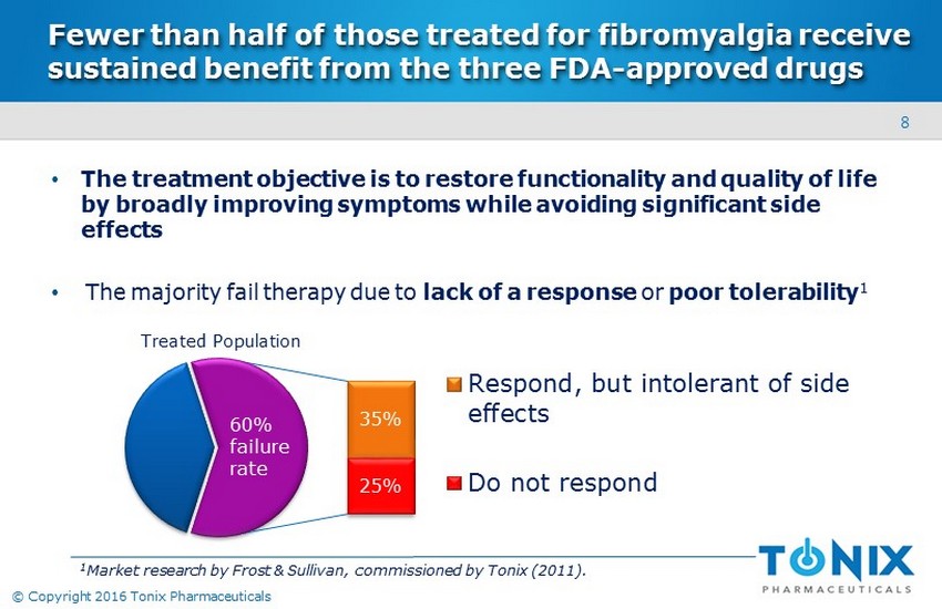 7 © Copyright 2016 Tonix Pharmaceuticals Fibromyalgia is a prevalent disorder but remains underdiagnosed 1 Lawrence et al, Arthritis Rheum 2008;58:26; Vincent et al, Arthritis Care Res 2013;65:786; Jones et al, Arthritis Rheum 2015;67:568; U.S . Census Bureau, 2013 Projection . 2 Robinson RL et al, Pain Med 2012;13:1366. 3 Product sales derived from IMS MIDAS; IMS NDTI used to factor usage for fibromyalgia; data accessed April 2015. 4 Independent study conducted by IMS Consulting Group, April 2015 using IMS MIDAS (ex - manufacturing price), factored for fibromyalgia based on IMS National Disease and Therapeutic Index (NDTI). Affects 2 - 6% (5 - 15 M) of U.S. adults 1 • 1.1% diagnosis rate = 2.7 million U.S. adults 1 ‒ S uggests under - diagnosis • Approximately 2.3 million U.S. adults receive treatment 2 • Approved drugs achieved 2014 U.S. sales of $1.2 billion 3 ‒ Represent about 5.6 million prescriptions 4 Estimated that >22 million prescriptions are issued for the treatment of fibromyalgia (on - and off - label usage) each year 2,4
