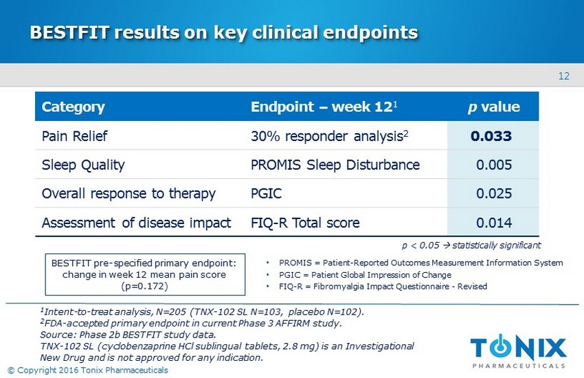 11 © Copyright 2016 Tonix Pharmaceuticals Phase 2b “BESTFIT” study of TNX - 102 SL in fibromyalgia • BESTFIT = BE dtime S ublingual T NX - 102 SL as F ibromyalgia I ntervention T herapy ‒ Randomized , double - blind, placebo - controlled trial ‒ 2010 American College of Rheumatology diagnostic criteria for fibromyalgia ‒ 205 participants randomized 1:1 at 17 U.S. sites ‒ S ublingual tablet of TNX - 102 SL 2.8 mg or placebo daily at bedtime for 12 weeks ‒ Evaluated measures of pain, sleep quality, and other assessments of fibromyalgia TNX - 102 SL (cyclobenzaprine HCl sublingual tablets, 2.8 mg) is an Investigational New Drug and is not approved for any indication.