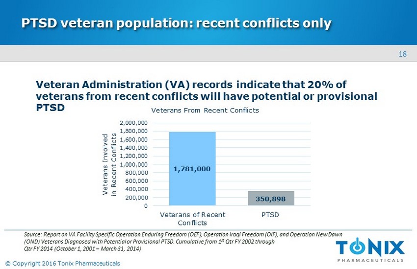 17 © Copyright 2016 Tonix Pharmaceuticals PTSD is a prevalent problem for both civilians and the military • ~70% are considered to have moderate to severe symptoms • Of those diagnosed, ~50% utilize professional healthcare (psycho/pharmacotherapy) 2 1 Kessler RC at al, Arch Gen Psychiatry 2013;62:617; U.S. Census Bureau, 2013 Projection. 2 Wang et al, Arch Gen Psychiatry 2005;62:629. 3 Report on VA Facility Specific Operation Enduring Freedom (OEF), Operation Iraqi Freedom (OIF), and Operation New Dawn (OND) Veterans Diagnosed with Potential or Provisional PTSD. 4 Bowe et al, J Dual Diagnosis 2015;11:22. Affects 3.5% (8.5 M) U.S. Adults 1 • Higher prevalence in military population - 20% of veterans from recent conflicts will have potential/provisional PTSD 3 - ~638,000 veterans with PTSD in the VA health system ( 2012) 4 - Majority are male - Alcohol and substance abuse are common