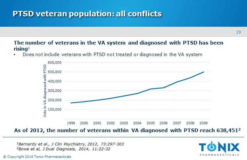 18 © Copyright 2016 Tonix Pharmaceuticals PTSD veteran population: recent conflicts only Veteran Administration (VA) records indicate that 20% of veterans from recent conflicts will have potential or provisional PTSD Source: Report on VA Facility Specific Operation Enduring Freedom (OEF), Operation Iraqi Freedom (OIF), and Operation New Daw n (OND) Veterans Diagnosed with Potential or Provisional PTSD. Cumulative from 1 st Qtr FY 2002 through Qtr FY 2014 (October 1, 2001 – March 31, 2014) 1,781,000 350,898 0 200,000 400,000 600,000 800,000 1,000,000 1,200,000 1,400,000 1,600,000 1,800,000 2,000,000 Veterans of Recent Conflicts PTSD Veterans Involved in Recent Conflicts Veterans From Recent Conflicts