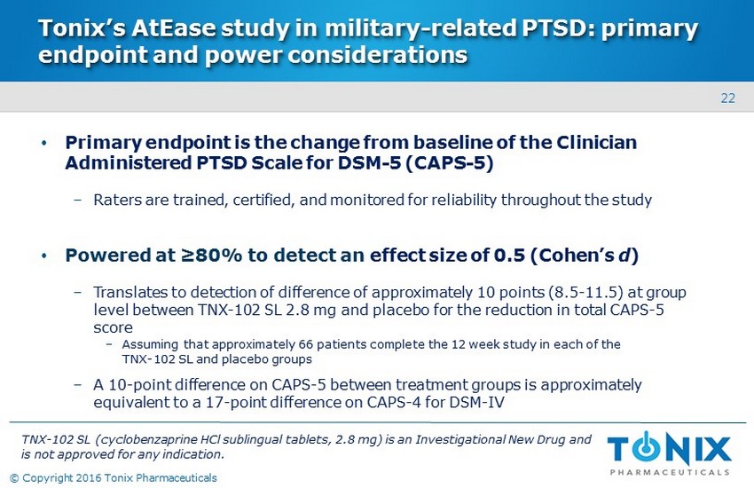21 © Copyright 2016 Tonix Pharmaceuticals Targeting sleep quality is a novel mechanism of action in PTSD therapy • PTSD patients complain of sleep disturbance as a core symptom 1 ‒ Distressing dreams (nightmares) are part of “re - experiencing” ‒ Avoidance can be of bed/sleep due to fear of nightmares ‒ Restless sleep is part of the “hyper - arousal” cluster of PTSD diagnostic criteria • Sleep disturbance after trauma is linked to onset of PTSD 2 • Sleep disturbance also correlates with depression, substance abuse and suicidal behaviors in PTSD 3 • TNX - 102 SL is a tricyclic molecule that potently targets three molecular mechanisms 4 , each of which is associated with treating aspects of disturbed sleep, enhancing sleep quality ‒ Blocks the 5 - HT 2A receptor (like trazodone ) ‒ Blocks the α 1 adrenergic receptor (like prazosin ) ‒ Blocks the H 1 receptor (like low - dose doxepin) 1 American Psychiatric Association: Diagnostic and Statistical Manual of Mental Disorders, Fifth Edition, 2013. 2 Koren et al, AJP 159:855 - 857, 2002; Mellman et al, AJP 159:1969 - 1701, 2002. 3 Germain , AJP 170:372 - 382, 2013; McHugh et al, J Traumatic Stress 27:82 - 89, 2014 Betts et al, Journal of Anxiety Disorders 27:735 - 41, 2013. 4 Daugherty et al, Society of Biological Psychiatry 70 th Annual Scientific Convention, May 14 - 16, 2015 Toronto, Ontario, Canada. T NX - 102 SL (cyclobenzaprine HCl sublingual tablets, 2.8 mg) is an Investigational New Drug and is not approved for any indication.