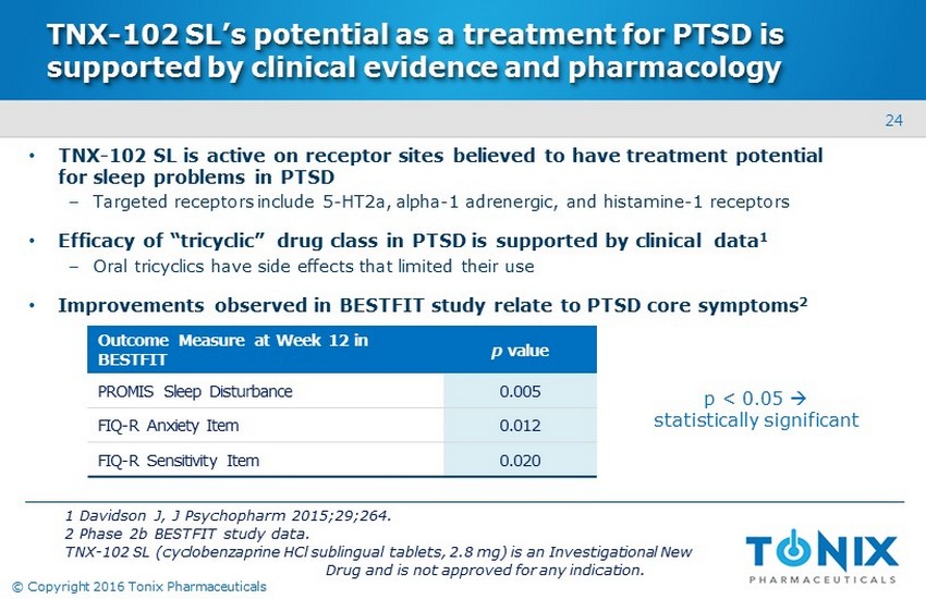 23 © Copyright 2016 Tonix Pharmaceuticals Limitations of current FDA - approved pharmacotherapies for PTSD • Britain’s National Institute for Clinical Excellence (NICE) National Clinical Practice Guideline for management of PTSD reported an effect size in paroxetine trials of 0.42 and for sertraline trials, the effect size was 0.26 1 ‒ A priori, NICE had set a threshold of 0.5 as an effect size that would indicate a clinically meaningful effect on PTSD ‒ NICE stated that neither of these two FDA - approved therapies had conclusive evidence to determine if there was a clinically important difference from placebo • Limited treatment response to SSRIs in males and US military ‒ In a review of sertraline registration trials, no effect on PTSD demonstrated for male subgroups in an FDA - conducted post - hoc analysis ‒ None of the four double - b lind placebo - controlled trials of SSRIs in U.S. military veterans demonstrated any evidence that SSRIs were superior to placebo 2 1 National Clinical Practice Guideline No. 26, National Institute for Clinical Excellence, 2005. 2 Davidson J, Journal of Psychopharmacology, 2015.
