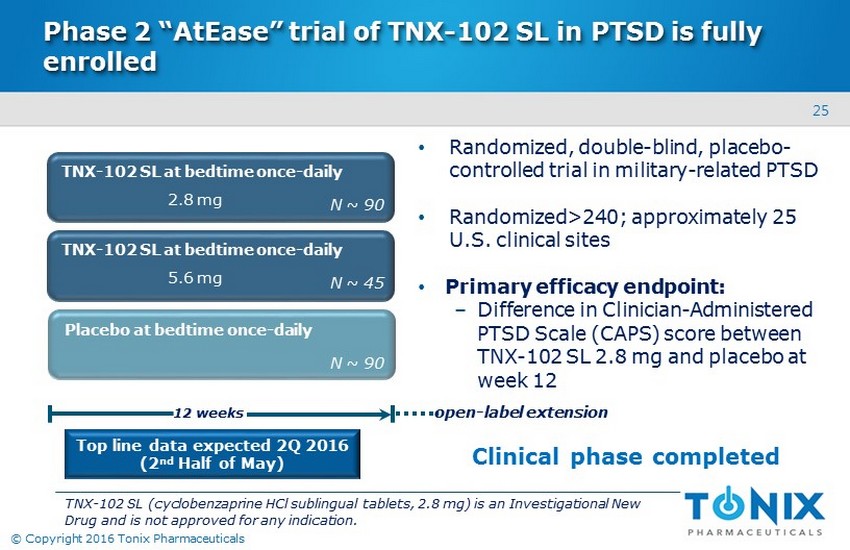 24 © Copyright 2016 Tonix Pharmaceuticals TNX - 102 SL’s potential as a treatment for PTSD is supported by clinical evidence and pharmacology • TNX - 102 SL is active on receptor sites believed to have treatment potential for sleep problems in PTSD ‒ Targeted receptors include 5 - HT2a, alpha - 1 adrenergic, and histamine - 1 receptors • Efficacy of “tricyclic” drug class in PTSD is supported by clinical data 1 ‒ Oral tricyclics have side effects that limited their use • Improvements observed in BESTFIT study relate to PTSD core symptoms 2 Outcome Measure at Week 12 in BESTFIT p value PROMIS Sleep Disturbance 0.005 FIQ - R Anxiety Item 0.012 FIQ - R Sensitivity Item 0.020 1 Davidson J, J Psychopharm 2015;29;264. 2 Phase 2b BESTFIT study data. TNX - 102 SL (cyclobenzaprine HCl sublingual tablets, 2.8 mg) is an Investigational New Drug and is not approved for any indication . p < 0.05 statistically significant