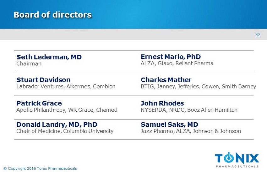 31 © Copyright 2016 Tonix Pharmaceuticals Management team Seth Lederman, MD President & CEO Jessica Edgar Morris EVP, Administration Bruce Daugherty, PhD, MBA Chief Scientific Officer Ronald Notvest, PhD E VP, Commercial Planning & Development Gregory Sullivan, MD Chief Medical Officer Bradley Saenger, CPA Chief Financial Officer