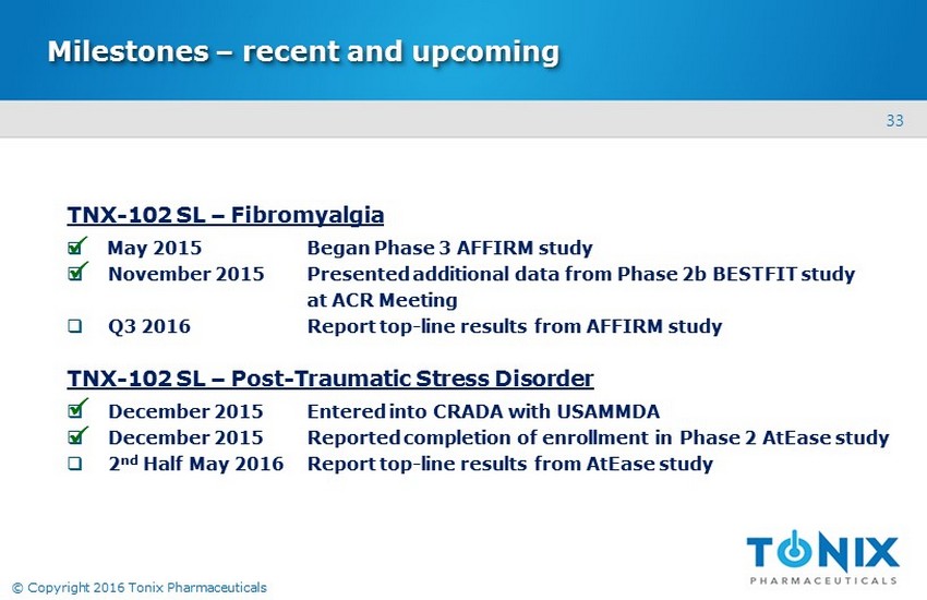 32 © Copyright 2016 Tonix Pharmaceuticals Board of directors Seth Lederman, MD Chairman Ernest Mario, PhD ALZA, Glaxo, Reliant Pharma John Rhodes NYSERDA, NRDC, Booz Allen Hamilton Samuel Saks, MD Jazz Pharma, ALZA, Johnson & Johnson Charles Mather BTIG, Janney, Jefferies, Cowen, Smith Barney Stuart Davidson Labrador Ventures, Alkermes , Combion Patrick Grace Apollo Philanthropy, WR Grace, Chemed Donald Landry, MD, PhD Chair of Medicine, Columbia University