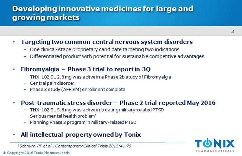2 © Copyright 2016 Tonix Pharmaceuticals Cautionary note on forward - looking statements Certain statements in this presentation regarding strategic plans, expectations and objectives for future operations or results are “forward - looking statements” as defined by the Private Securities Litigation Reform Act of 1995 . These statements may be identified by the use of forward - looking words such as “anticipate,” “believe,” “forecast,” “estimate,” and “intend,” among others . These forward - looking statements are based on Tonix’s current expectations and actual results could differ materially . There are a number of factors that could cause actual events to differ materially from those indicated by such forward - looking statements . These factors include, but are not limited to, substantial competition ; our possible need for additional financing ; uncertainties of patent protection and litigation ; uncertainties of government or third party payor reimbursement ; limited research and development efforts and dependence upon third parties ; and risks related to failure to obtain U . S Food and Drug Administration clearances or approvals and noncompliance with its regulations . As with any pharmaceutical under development, there are significant risks in the development, regulatory approval and commercialization of new products . The forward - looking statements in this presentation are made as of the date of this presentation, even if subsequently made available by the Company on its website or otherwise . Tonix does not undertake an obligation to update or revise any forward - looking statement, except as required by law . Investors should read the risk factors set forth in the Annual Report on Form 10 - K for the year ended December 31 , 2015 , as filed with the Securities and Exchange Commission (the “SEC”) on March 3 , 2016 , and future periodic reports filed with the SEC on or after the date hereof . All of the Company's forward - looking statements are expressly qualified by all such risk factors and other cautionary statements .