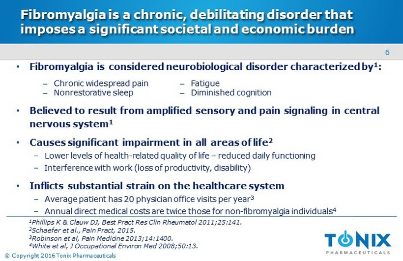 5 © Copyright 2016 Tonix Pharmaceuticals Concept: Fibromyalgia is inappropriate central pain signaling in the absence of peripheral injury Volkswagen Check Engine [Photograph]. (2011, October 14). Wikipedia • Pain is a sensor system in the brain similar to a check engine light on a car’s dashboard • When the check engine light malfunctions, the light is on even though the car is not malfunctioning • Similarly, in fibromyalgia, the pain alarm is turned on even though there has been no peripheral nerve tissue injury