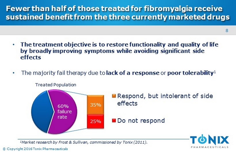 7 © Copyright 2016 Tonix Pharmaceuticals Fibromyalgia is a prevalent disorder but remains underdiagnosed 1 Lawrence et al, Arthritis Rheum 2008;58:26; Vincent et al, Arthritis Care Res 2013;65:786; Jones et al, Arthritis Rheum 2015;67:568; U.S. Census Bureau, 2013 Projection . 2 Robinson RL et al, Pain Med 2012;13:1366. 3 Independent study conducted by IMS Consulting Group, April 2015 using IMS MIDAS (ex - manufacturing price), factored for fibromyalgia based on IMS National Disease and Therapeutic Index (NDTI). 4 Product sales derived from IMS MIDAS; IMS NDTI used to factor usage for fibromyalgia; data accessed April 2015. Affects 2 - 6% (5 - 15 M) of U.S. adults 1 • 1.1% diagnosis rate = 2.7 million U.S. adults 1 ‒ Suggests under - diagnosis • Approximately 2.3 million U.S. adults receive treatment 2 • Approved drugs achieved 2014 U.S. sales of $1.2 billion 4 ‒ Represent about 5.6 million prescriptions 3 Estimated that >22 million prescriptions are issued for the treatment of fibromyalgia (on - and off - label usage) each year 2,3