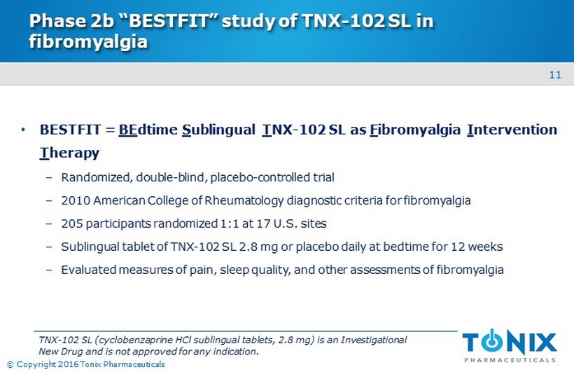 10 © Copyright 2016 Tonix Pharmaceuticals Tonix is developing TNX - 102 SL for fibromyalgia • Advanced sublingual tablet containing low - dose cyclobenzaprine (CBP) ‒ Designed for daily bedtime administration with no titration ‒ Efficient transmucosal absorption ‒ Avoidance of first - pass metabolism reduces formation of long - lived metabolite • TNX - 102 SL’s pharmacologic action is believed to improve sleep quality ‒ Non - restorative sleep is a common clinical and diagnostic feature of fibromyalgia 1 ‒ Evolving understanding of the role of sleep in pain control and fibromyalgia development 2 ‒ TNX - 102 SL targets receptors believed to play key roles in sleep physiology • Phase 2b “BESTFIT” study was successfully completed in 3Q14 • Topline data from ongoing Phase 3 “AFFIRM” study expected to report in 3Q16 1 Swick TJ, Ther Adv Musculoskel Dis 2011;3:167 - 178. 2 Choy EH, Nat Rev Rheumatol ; 2015: 11:513 - 520. TNX - 102 SL (cyclobenzaprine HCl sublingual tablets, 2.8 mg) is an Investigational New Drug and is not approved for any indication.