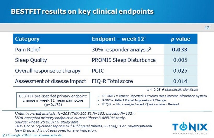11 © Copyright 2016 Tonix Pharmaceuticals Phase 2b “BESTFIT” study of TNX - 102 SL in fibromyalgia • BESTFIT = BE dtime S ublingual T NX - 102 SL as F ibromyalgia I ntervention T herapy ‒ Randomized, double - blind, placebo - controlled trial ‒ 2010 American College of Rheumatology diagnostic criteria for fibromyalgia ‒ 205 participants randomized 1:1 at 17 U.S. sites ‒ Sublingual tablet of TNX - 102 SL 2.8 mg or placebo daily at bedtime for 12 weeks ‒ Evaluated measures of pain, sleep quality, and other assessments of fibromyalgia TNX - 102 SL (cyclobenzaprine HCl sublingual tablets, 2.8 mg) is an Investigational New Drug and is not approved for any indication.