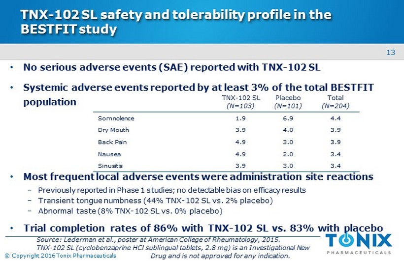 12 © Copyright 2016 Tonix Pharmaceuticals BESTFIT results on key clinical endpoints Category Endpoint – week 12 1 p value Pain Relief 30% responder analysis 2 0.033 Sleep Quality PROMIS Sleep Disturbance 0.005 Overal l response to therapy PGIC 0.025 Assessment of disease impact FIQ - R Total score 0.014 1 Intent - to - treat analysis, N=205 (TNX - 102 SL N=103, placebo N=102). 2 FDA - accepted primary endpoint in current Phase 3 AFFIRM study. Source: Phase 2b BESTFIT study data. TNX - 102 SL (cyclobenzaprine HCl sublingual tablets, 2.8 mg) is an Investigational New Drug and is not approved for any indication. BESTFIT pre - specified primary endpoint: change in week 12 mean pain score (p=0.172) • PROMIS = Patient - Reported Outcomes Measurement Information System • PGIC = Patient Global Impression of Change • FIQ - R = Fibromyalgia Impact Questionnaire - Revised p < 0.05 statistically significant