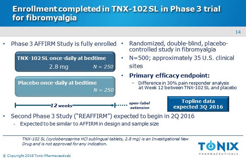 13 © Copyright 2016 Tonix Pharmaceuticals TNX - 102 SL safety and tolerability profile in the BESTFIT study • No serious adverse events (SAE) reported with TNX - 102 SL • Systemic adverse events reported by at least 3% of the total BESTFIT population • Most frequent local adverse events were administration site reactions ‒ Previously reported in Phase 1 studies; no detectable bias on efficacy results ‒ Transient tongue numbness (44% TNX - 102 SL vs. 2% placebo) ‒ Abnormal taste (8% TNX - 102 SL vs. 0% placebo) • Trial completion rates of 86% with TNX - 102 SL vs. 83% with placebo Source: Lederman et al., poster at American College of Rheumatology, 2015. TNX - 102 SL (cyclobenzaprine HCl sublingual tablets, 2.8 mg) is an Investigational New Drug and is not approved for any indication. TNX - 102 SL (N=103) Placebo (N=101) Total (N=204) Somnolence 1.9 6.9 4.4 Dry Mouth 3.9 4.0 3.9 Back Pain 4.9 3.0 3.9 Nausea 4.9 2.0 3.4 Sinusitis 3.9 3.0 3.4