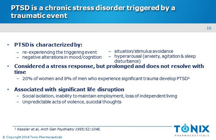 15 © Copyright 2016 Tonix Pharmaceuticals TNX - 102 SL in Phase 2 development for post - traumatic stress disorder (PTSD) Phase 1 Phase 2 Phase 3 NDA * Tonmya ® has been conditionally accepted by the FDA as the proposed tradename of TNX - 102 SL for fibromyalgia. NDA = New Drug Application; FDA = U.S. Food and Drug Administration. T NX - 102 SL (cyclobenzaprine HCl sublingual tablets, 2.8 mg) is an Investigational New Drug and is not approved for any indication. Candidate Indication Near - term Catalyst TNX - 102 SL ( Tonmya ® *) 2.8 mg Fibromyalgia Top line data 3Q 2016 TNX - 102 SL 5.6 mg Post - Traumatic Stress Disorder Phase 3 Starting 1Q 2017 Preclinical Phase 1 Phase 2 Phase 3 NDA Market