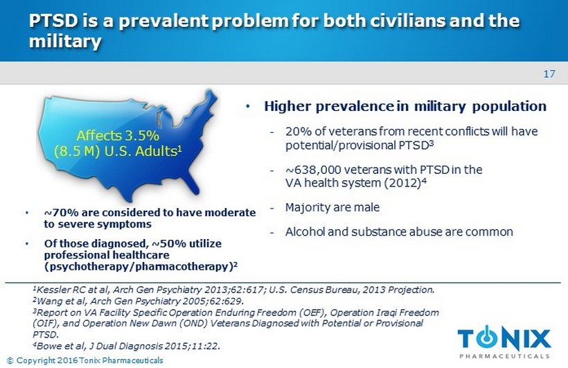 16 © Copyright 2016 Tonix Pharmaceuticals PTSD is a chronic stress disorder triggered by a traumatic event • PTSD is characterized by: • Considered a stress response, but prolonged and does not resolve with time ‒ 20% of women and 8% of men who experience significant trauma develop PTSD 1 • Associated with significant life disruption ‒ Social isolation, inability to maintain employment, loss of independent living ‒ Unpredictable acts of violence, suicidal thoughts – re - experiencing the triggering event – negative alterations in mood/cognition – situation/stimulus avoidance – hyperarousal (anxiety, agitation & sleep disturbance) 1 Kessler et al, Arch Gen Psychiatry 1995;52:1048.