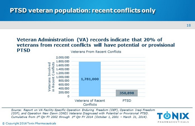 17 © Copyright 2016 Tonix Pharmaceuticals PTSD is a prevalent problem for both civilians and the military • ~70% are considered to have moderate to severe symptoms • Of those diagnosed, ~50% utilize professional healthcare ( psychotherapy/pharmacotherapy) 2 1 Kessler RC at al, Arch Gen Psychiatry 2013;62:617; U.S. Census Bureau, 2013 Projection. 2 Wang et al, Arch Gen Psychiatry 2005;62:629. 3 Report on VA Facility Specific Operation Enduring Freedom (OEF), Operation Iraqi Freedom (OIF), and Operation New Dawn (OND) Veterans Diagnosed with Potential or Provisional PTSD. 4 Bowe et al, J Dual Diagnosis 2015;11:22. Affects 3.5% (8.5 M) U.S. Adults 1 • Higher prevalence in military population - 20% of veterans from recent conflicts will have potential/provisional PTSD 3 - ~638,000 veterans with PTSD in the VA health system (2012) 4 - Majority are male - Alcohol and substance abuse are common